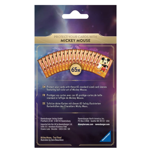 Jede Packung enthält fünfundsechzig Kartenhüllen mit Motiven eines Disney Lorcana Glimmers.