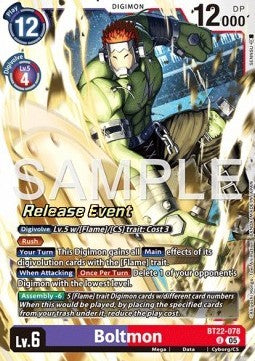 Boltmon (BT22-078) / Boltmon (BT22-078) Erweiterung: Promos: Cyber EdenSeltenheit: Alternative ArtSprache: Englisch